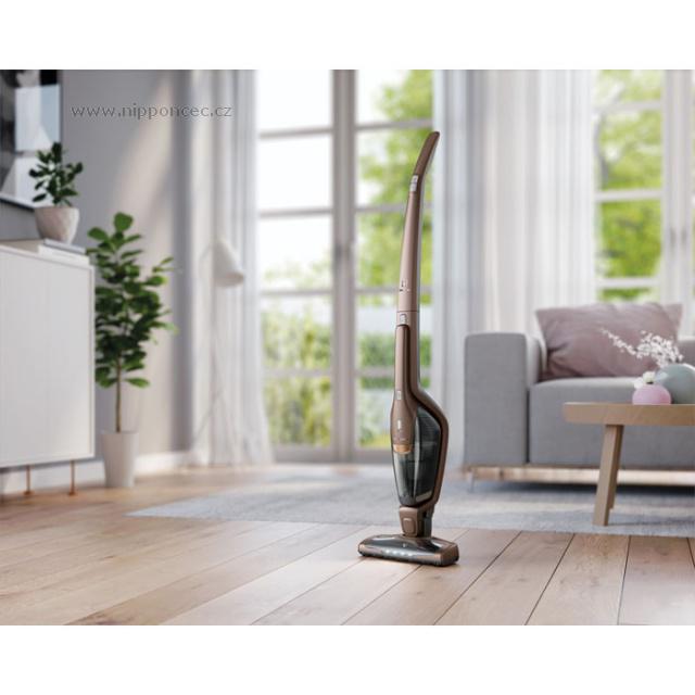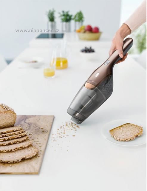 Provoz zajišťují akumulátory Sony Li-ion 18 V (1500mAh), které umožňují až 45 minutové vysávání na jedno nabití. Díky těmto samodobíjecím bateriím je tedy přenosný a vhodný pro rychlé a snadné použití. Po vybití je možné jej dobít v dobíjecím stojánku, který v sobě navíc ukrývá kartáček a štěrbinovou hubici. A pokud jste při úklidu vyrušeni, nevadí, spotřebič můžete kdykoliv a kdekoliv zaparkovat. Není ho totiž nutné opírat, design sám zajistí samostatné stání.