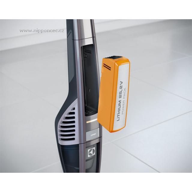 Bezsáčkový vysavač 2 v 1 (tyčový a ruční) s rotačním kartáčem, patentovaný systém Brush roll Clean (BRC), cyklónová jednotka, samostatně stojící poloha, LED diody integrované v podlahové hubici pro přehledný úklid, akumulátory Li-Ion - 18 V, nádoba na nečistoty objem 0,5 l, dobíjecí stojánek s příslušenstvím (kartáček a štěrbinová hubice), váha samostatného vysavače je 1,08 kg, celkem váží 2,46 kg, hlučnost - 79 dB(A), barva: metalická wolframová