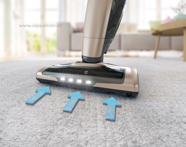 Díky LED diodám, které jsou integrované v podlahové hubici, uvidíte prostor pod každým nábytkem a v každém skrytém místě. Akumulátory Sony Li-Ion - 32,4V(1500 mAh) postačí pro nepřetržitý úklid v délce trvání až 95 min. O jejich nabití budete informováni pomocí LED diody a pro jejich nabití slouží dobíjecí stojánek, který je součástí balení. Se samostatně stojící parkovací polohou snadno vysavač uklidíte. Nádoba na nečistoty má objem 0,8 litru.