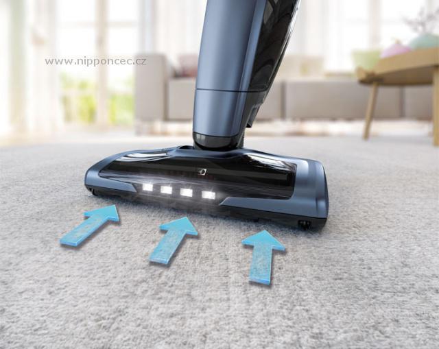 Díky LED diodám, které jsou integrované v podlahové hubici, uvidíte prostor pod každým nábytkem a v každém skrytém místě. Akumulátory Sony Li-Ion - 32,4V postačí pro nepřetržitý úklid v délce trvání až 95 min. O jejich nabití budete informováni pomocí LED diody a pro jejich nabití slouží dobíjecí stojánek, který je součástí balení. Se samostatně stojící parkovací polohou snadno vysavač uklidíte. Nádoba na nečistoty má objem 0,8 litru.