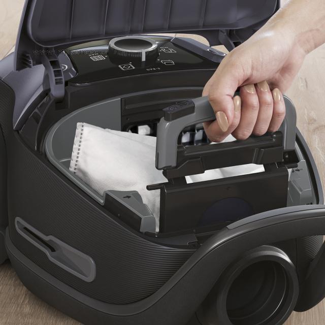 Sáček s-bag v sobě zachytává prach, aby neunikl zpět do vaší domácnosti, když vysáváte. Držadlo CleanLift vám umožňuje jej hygienicky vycvaknout rychlým pohybem zápěstí. Jakmile je sáček zcela naplněn, vysavač sám upozorní na výměnu sáčku skrz indikace plného sáčku.
