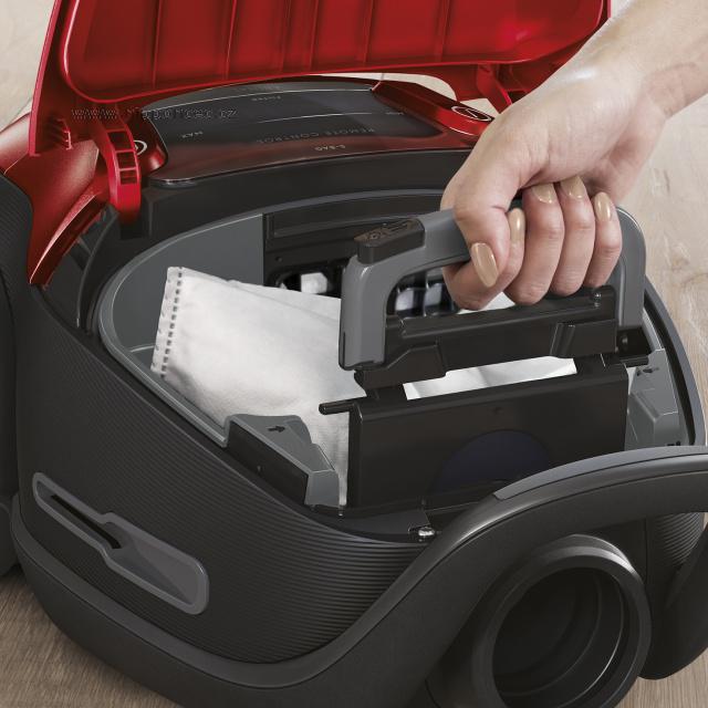 Sáček S-bag Anti-Odour v sobě zachytává prach a zvířecí chlupy, aby neunikly zpět do vaší domácnosti. Pokud je sáček plný, elektronický indikátor plného prachového sáčku a výměny filtru na tuto situaci sám upozorní. A držadlo CleanLift vám umožňuje v případě plného sáčku jej hygienicky vycvaknout rychlým pohybem zápěstí.
