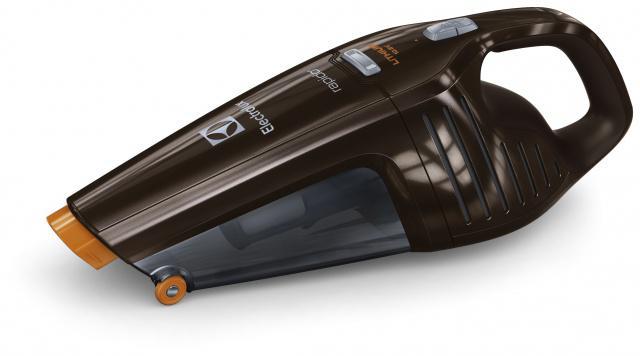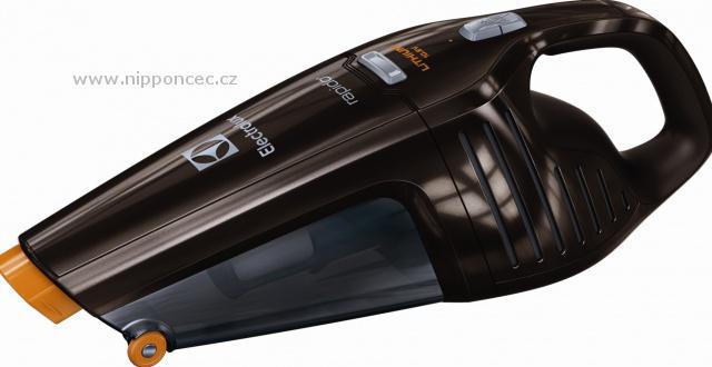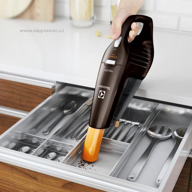 Rapido nové generace - Bezsáčkový ruční vysavač, suché vysávání, cyklónová jednotka - dvojitá filtrace, akumulátory Li-ion - 10,8 V (1500 mAh), dvě rychlosti, nádoba na nečistoty o objemu 0,5l, LED diodová kontrola stavu dobíjení, dobíjecí stojánek s možností montáže na stěnu, integrované příslušenství (štěrbinová hubice, kartáček) barva hnědá metalická