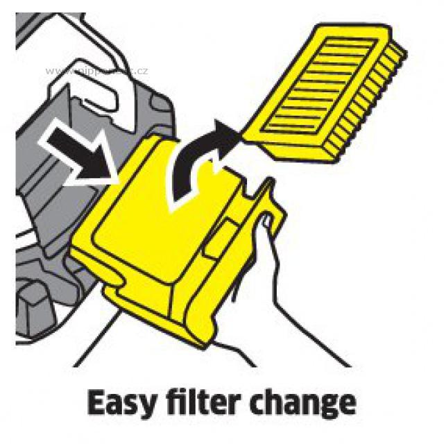 Vysavač je vybaven plochým skládaným filtrem, který je pro rychlé a hygienické vyjmutí usazen ve filtrační kazetě. Stačí kazetu pouhým stiskem vyklopit a to bez jakéhokoliv kontaktu s nečistotami. Filtr je navíc vhodný jak pro vysávání mokrých, tak i suchých nečistot, proto jej není potřeba při změně druhu vysávání měnit.