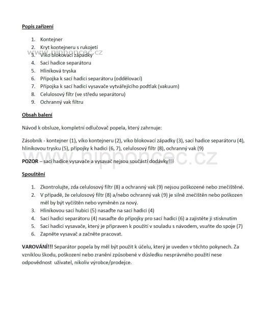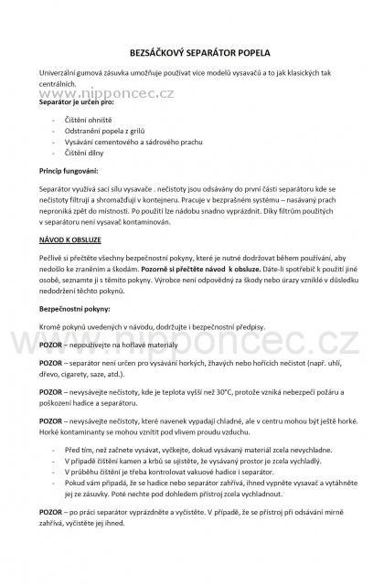 Separátor - bezsáčkový odlučovač nečistot - je vhodný k použití s většinou vysavačů. Lze jej připojit snadno k mnoha vysavačům různých značek díky gumovému přípojnému vstupu (vlastní průměr otvoru 25 mm), které obemkne koncovku hadice vašeho vysavače o průměru 32 až 35 mm.
