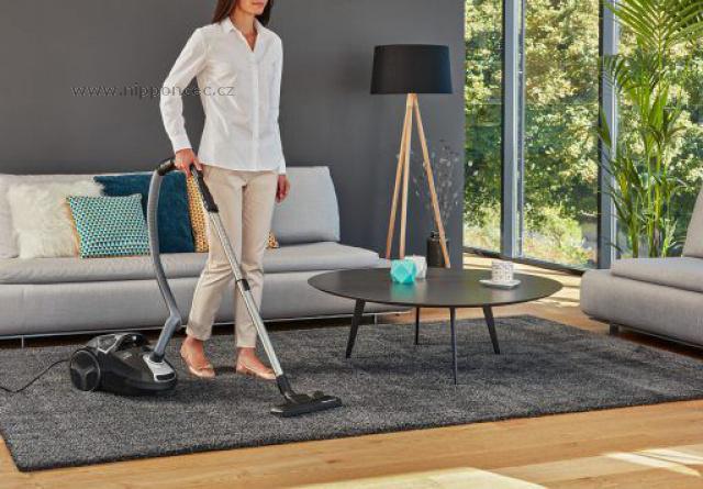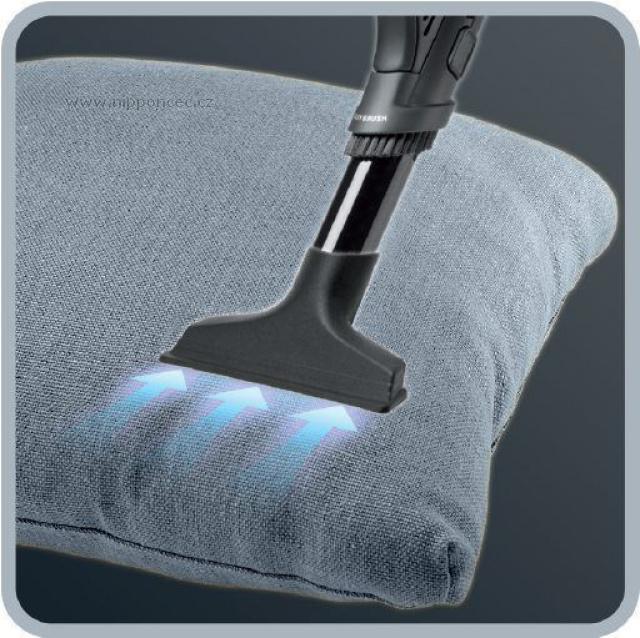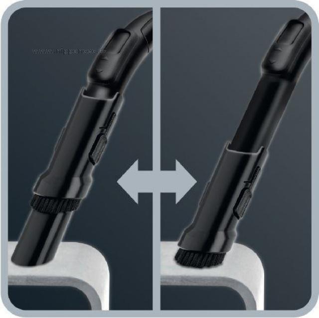 Součástí je široké příslušenství: kovové teleskopy, parketová hubice, multifunkční kombinovaná přepínací hubice, nástavec na čalounění, mini turbokartáč, EASY BRUSH - intergrovaný kartáček v rukojeti. Délka kabelu je 5m a akční rádius vysavače je neuvěřitelných 7,6 m.