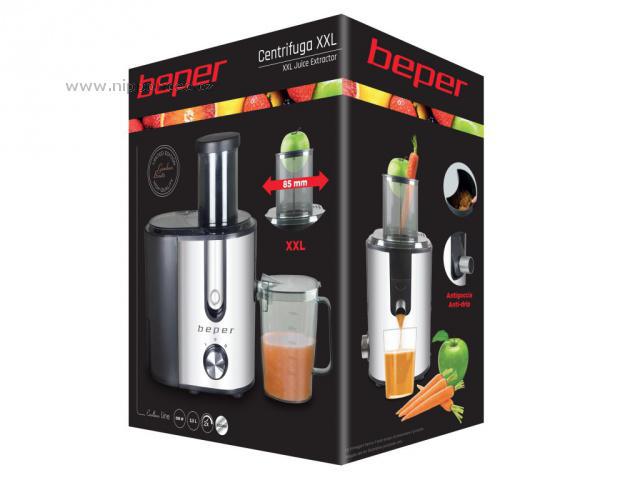 Výkonný odšťavňovač BEPER 90424 na ovoce a zeleninu je vybaven otvorem XL o průměru 85 mm a umožňuje vkládání celých potravin. Disponuje provozním LED světlem. Odšťavňovač je vybavený bezpečnostním systémem zabraňujícím vznícení v případě nesprávné montáže. Protiskluzová základna zaručuje stabilitu a odnímatelné části zajistí snadné čištění.