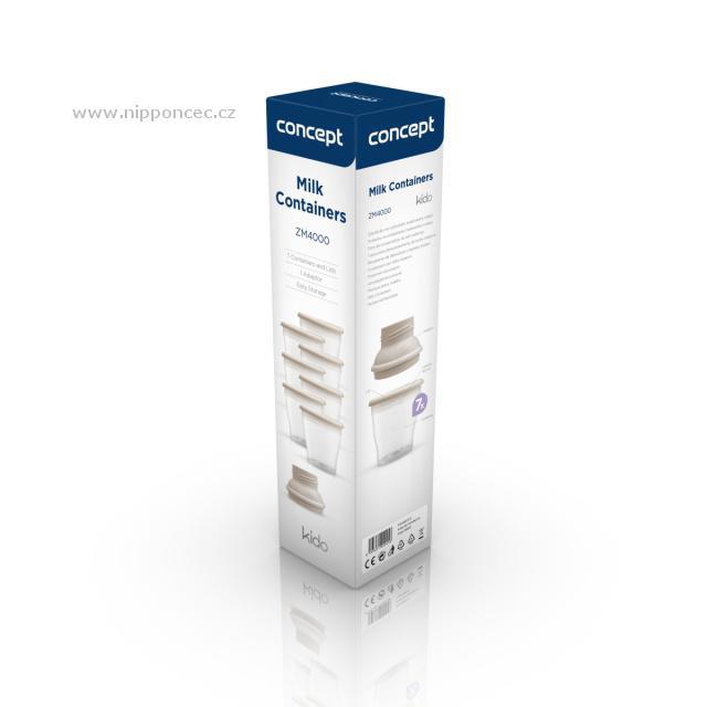 Set zásobníků na uskladnění mateřského mléka Concept ZM4000 slouží pro hygienické uskladnění nejen mateřského mléka, ale i příkrmů. Obsahuje 7 zásobníků s víčkem a 1 nástavec na krmení/odsávání, který je plně kompatibilní s odsávačkou Concept OM4000. Disponují širokým hrdlem pro snadné plnění a šroubovacími víčky, které dobře těsní a chrání vnitřní obsah před vytečením. Zásobníky lze mýt v myčce nádobí a sterilizovat pomocí horké vody. Můžete je uložit v lednici či mrazáku. Set zásobníků na uskladnění mateřského mléka Concept ZM4000 slouží pro hygienické uskladnění nejen mléka, ale i příkrmů.