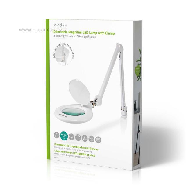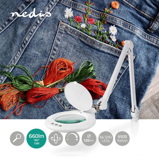 Nedis flexibilní stolní lampa s lupou je ideální pro detailní práci s malými díly, jak v práci, tak pro koníčky. Disponuje výkonným zvětšením (1,75x) se 3 dioptriemi. Je toho dosaženo použitím skleněné čočky o průměru 120 milimetrů. Světlo lze snadno ztlumit pomocí dotykového stmívače na horní straně. Lupa je osvícena 56 diodami SMD LED s intenzitou osvětlení 660 lumenů a teplotou světla 6 500 kelvinů. V horní části je ochranná krytka a světla jsou zakryta průhledným krytem, který zajistí velmi jasné a čisté světlo. Flexibilní otočné rameno může být svorkou připevněno ke stolu nebo jinému povrchu. Délka ramene je 125 centimetrů. To znamená, že si světlo můžete uzpůsobit pro každý druh práce.